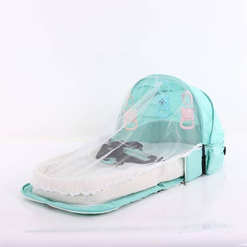 1* Cama de bebê, com proteção para cabeça e cortina contra mosquitos