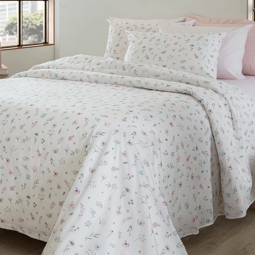 O Jogo de Cama Kacyumara Mariposy tem estilo romântico e delicado que combina com os mais variados gostos, com cores leves e alegres e estampa de lindas borboletas.